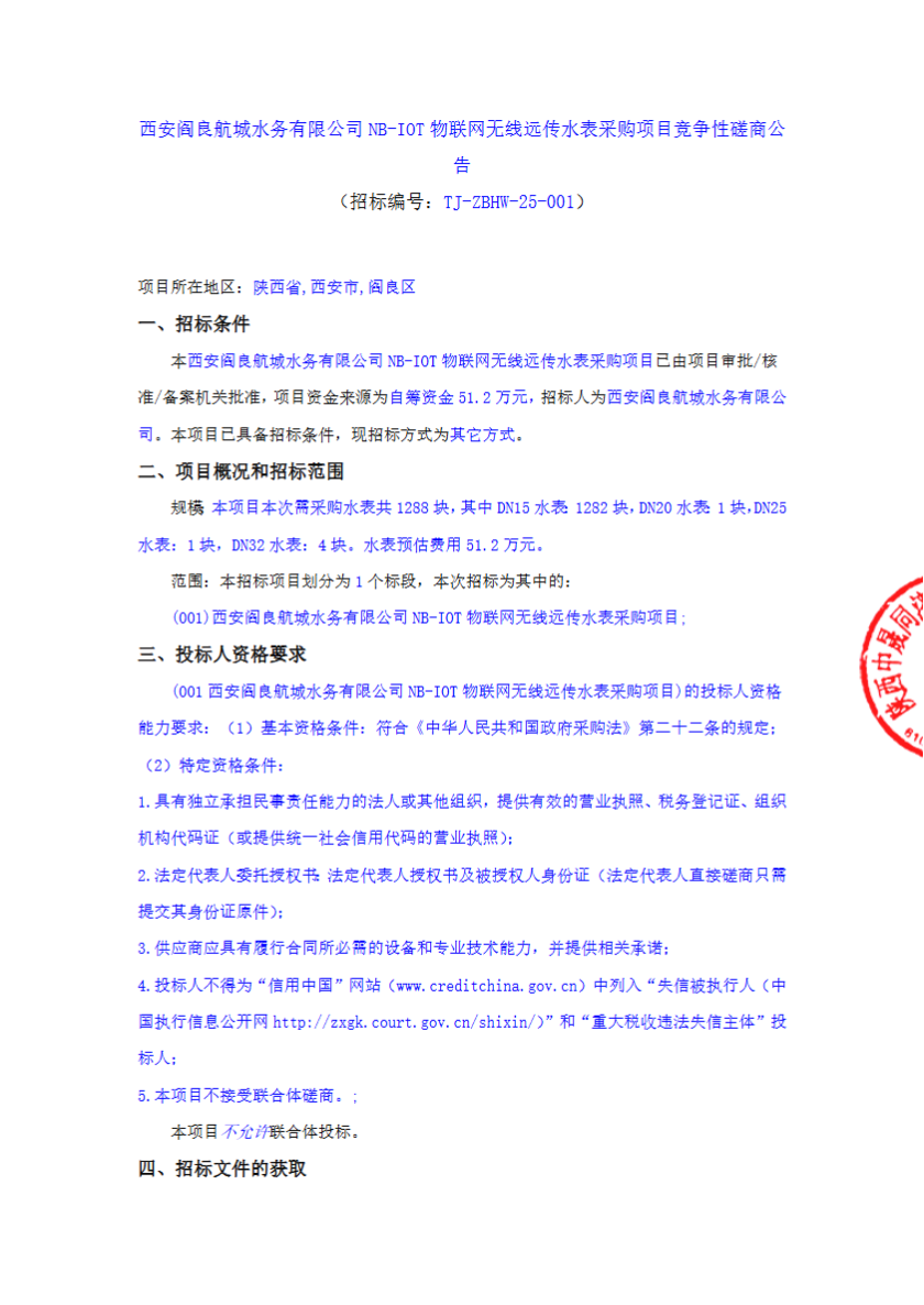 招标公告 | 西安阎良航城水务有限公司NB-IOT物联网无线远传水表采购项目