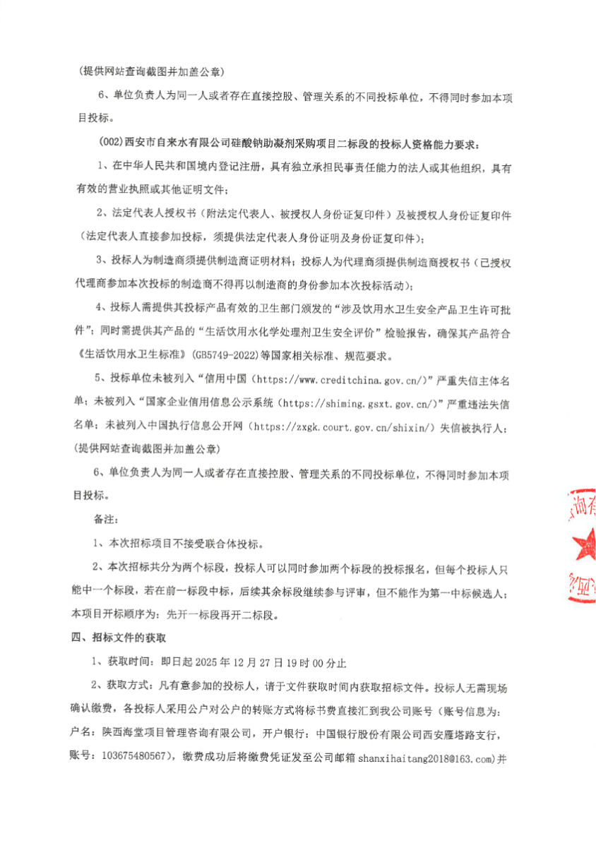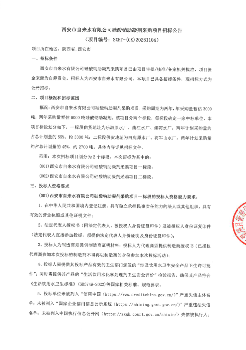 招标公告 | 西安市自来水有限公司硅酸钠助凝剂采购项目